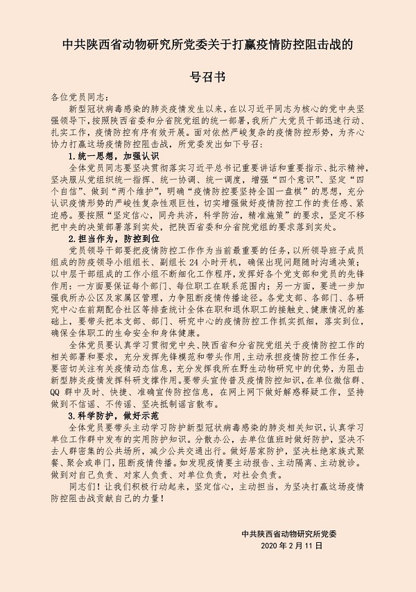 中共陜西省動(dòng)物研究所黨委關(guān)于打贏疫情防控阻擊戰(zhàn)的號(hào)召書