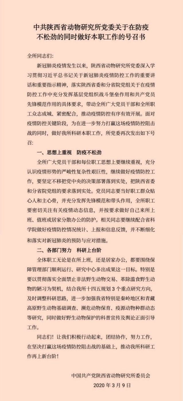 中共陜西省動(dòng)物研究所黨委關(guān)于在防疫不松勁的同時(shí)做好本職工作的號召書
